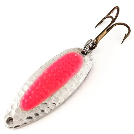 Met een gewicht van 1/2 oz (14 g) is deze zware koperen body gebouwd om kustwinden te doorklieven en met gemak diepe rivierkolken te bereiken. De lengte van 2 1/4" (5,5 cm) is voorzien van een klassieke gehamerde nikkelafwerking, ontworpen om licht te verstrooien zoals de reflecterende schubben van een aasvis. Een kenmerkend aspect van productcode 12363 is de unieke gesimuleerde zalmeitje-insert; op dit specifieke Blue Fox Pixee UV model zorgt die rode insert voor een zeer zichtbaar richtpunt dat intens oplicht in donker water of bij weinig licht. Hij is uitgerust met een bronzen dreg en een stevige splitring, klaar voor de strijd met zalm, steelhead of snoek. Dit kunstaas stamt af van de originele National Expert Bait ontwerpen, geperfectioneerd voor een natuurlijke rol en beweging in rivierstromingen of een stabiele baan tijdens het trollen. Dit exemplaar verkeert in uitstekende staat, vertoont duidelijke tekenen van zorgvuldige opslag en krijgt een conditiescore van 5/5.