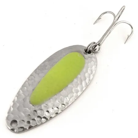 Met een lengte van 6,5 cm (2 1/2 inch) is het zware messing lichaam van deze lepel gebouwd om door kustwinden heen te werpen en de diepe plekken te bereiken waar zalm en steelhead zich vaak ophouden. De gehamerde nikkelen afwerking zorgt voor een gestructureerd oppervlak dat licht vangt en weerkaatst, terwijl de felgele gesimuleerde zalmeitje-insert in het midden is ontworpen met een UV-gloed om zichtbaar te blijven in troebel water of bij weinig licht. Deze kunstlure van 24 g (3/4 oz), met productcode 12701, vertoont geen gebruikssporen en heeft een conditiebeoordeling van 5/5. Oorspronkelijk maakte dit model deel uit van de National Expert Bait (NEBCO) line-up voordat het merk overging naar Blue Fox. Het is voorzien van een hoogwaardige dreg, bevestigd via een robuuste splitring. Het is een effectieve keuze voor zowel het werpen in sterke rivierstromingen als voor het trollen op open water, waar de dichtheid een diepe presentatie mogelijk maakt. De voorzijde heeft een enkel bevestigingspunt dat bedoeld is voor gebruik met een speldwartel om een natuurlijke rollende actie tijdens het binnenvissen te bevorderen.