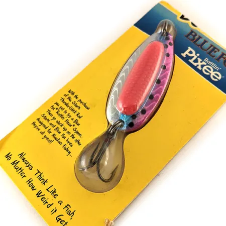 Met een gewicht van 1/2 oz (14 g) is deze zware messing lepel specifiek ontworpen voor verre worpen bij kustwind of sterke rivierstromingen. De Blue Fox Rattlin Pixee, herkenbaar aan productcode 12334, is voorzien van het iconische doorschijnende rode eierzak-inzetstuk dat een unieke visuele prikkel vormt voor soorten zoals zalm en steelhead. Dit exemplaar is ongebruikt en toont een levendige regenboogforel-afwerking op een gestructureerd holografisch oppervlak, met een lengte van 5,5 cm (2 1/4"). Op de messing onderzijde staat het modelnummer 01-30R gestanst, wat de gewichtsklasse bevestigt. De montage bestaat uit een scherpe Rapala VMC black nickel dreg, gekozen vanwege de duurzaamheid en corrosiebestendigheid in zowel zoet- als zoutwateromgevingen. Oorspronkelijk populair geworden in de ruige visserswereld van Alaska, gebruikt de Pixee zijn hoge dichtheid om diepere gaten en kolken te bereiken waar trofee-vissen zich vaak ophouden.
