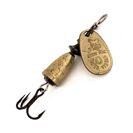 De originele Blue Fox-logo en "Super Vibrax" branding zijn direct in het messing blad gestanst, wat dit een klassieke spinner maat 0 maakt. Met een gewicht van 3,4 g (1/8 oz) meet dit compacte exemplaar exact 4,5 cm van het bovenste oogje tot de bocht van de dreg. De verouderde messing afwerking van het druppelvormige lichaam en het ovale blad weerspiegelt het authentieke vintage karakter (conditie 4/5). Op de achterkant van het blad staat de gravure "MADE IN FINLAND" samen met het Amerikaanse patent 4163338, een verwijzing naar het ontwerp tegen het kinken van de lijn. Het klokvormige lichaam bevat een intern tandwiel dat lage frequentie geluiden produceert wanneer de buitenste klok er tijdens het binnendraaien tegenaan tikt. Dit specifieke model, met productcode 13178, heeft de iconische messing afwerking die al lang een vaste waarde is voor de visserij op forel en baars in helder water. De hardware blijft robuust, met de originele dreg in een donkere afwerking stevig bevestigd aan de as. Deze oudere Finse modellen zijn zeer geliefd bij verzamelaars vanwege de specifieke resonantie van de messing klok en de precisie van de montage.