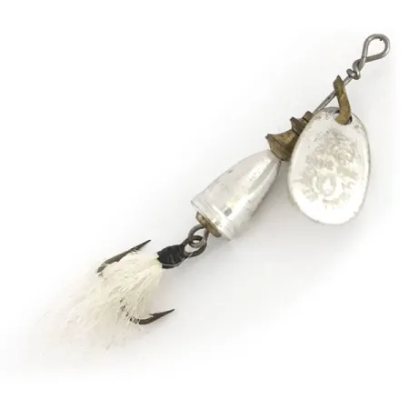 De verzilvering op het blad en het klokvormige lichaam geeft dit exemplaar een klassiek, lichtreflecterend profiel dat de aandacht trekt van elke liefhebber van vintage materiaal. Met een lengte van 5 cm en een gewicht van 3,54 g is deze Blue Fox Super Vibrax 0 Foxtail (Productcode 9146) voorzien van het kenmerkende tweedelige bel-ontwerp. Het blad is voorzien van de stempel 'MADE IN FRANCE', een detail waar verzamelaars naar op zoek zijn omdat het wijst op de vroege productieperiode van de Vibrax-lijn vóór de verplaatsing van de fabricagelocaties. Een handgebonden witte veren foxtail bedekt de dreg, wat een duidelijk visueel profiel en een zachtere textuur aan de staart toevoegt. De zilveren afwerking is nog steeds glanzend en de messingkleurige interne componenten zijn goed bewaard gebleven, waardoor deze spinner een conditiescore van 5/5 krijgt. Het belvormige lichaam is ontworpen om een laagfrequent zoemend geluid uit te zenden wanneer het interne onderdeel tegen de buitenkant draait tijdens een gelijkmatige inhaalbeweging. Een stevige staaldraadconstructie verbindt het gemonteerde blad met de versierde haak, waardoor de structurele integriteit behouden blijft voor toepassingen op forel of baars met licht materiaal.