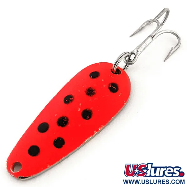 Met een gewicht van 1/2 oz (14 g) is het druppelprofiel van deze in Amerika gemaakte Blue Fox lepel ontworpen voor verre worpen. Het Tor-P-Do UV-model, met een lengte van precies 2" (5 cm) en productcode 12795, heeft een contrastrijke rode voorkant met zwarte stippen op een vernikkelde achterkant. De belangrijkste technische troef is de fluorescerende, UV-reactieve coating, die reageert op ultraviolet licht voor een optimale zichtbaarheid in troebel water of bij weinig licht. Een robuuste splitring verbindt de body met een gepolijste nikkelen dreg, wat zorgt voor een betrouwbare inhaking. Elk detail, van het strakke lakwerk tot het beslag, weerspiegelt de uitstekende 5/5 conditie. Het eenvoudige ontwerp maakt verschillende dieptes mogelijk, waarbij de relatief zware uitvoering zorgt voor een snelle afzinkfase. Een voorgeboord oog aan de kop biedt een stevig bevestigingspunt voor directe knopen of spelden.