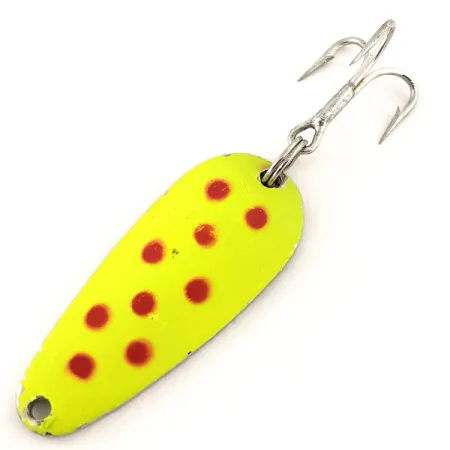 Deze in Amerika gemaakte lepel is gecoat in een levendige chartreuse lak met duidelijke rode stippen en is gebouwd voor hoge zichtbaarheid in wisselende waterhelderheid. In ongebruikte staat (beoordeling 6) blijft de afwerking scherp en reflecterend over het gehele profiel van 5 cm (2"). Hoewel de fluorescerende chartreuse opvalt bij daglicht, komt het specifieke nut van deze Blue Fox Tor-P-Do UV voort uit de reactieve coating die intens gloeit onder UV-licht, waardoor de rode stippen verschijnen als donkere strike points met een hoog contrast. Een stevige dreg is bevestigd met een robuuste splitring aan de gepolijste vernikkelde onderzijde, wat bijdraagt aan een totaalgewicht van 14 g (1/2 oz) voor effectief werpen of verticaal jiggen. Deze kunstvanger, met productcode 12796, gebruikt zijn druppelvorm en verzwaarde body om stabiliteit te behouden bij het trollen op diepte.