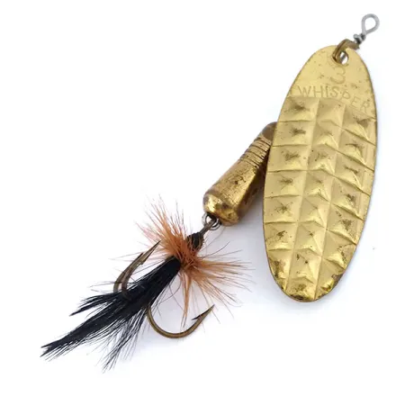 In het goudkleurige blad is het kenmerkende 'WHISPER'-merk gestanst, samen met een aanduiding van maat 3. Deze Blue Fox Whisper 3, herkenbaar aan productcode 10404, heeft een gehamerde diamanttextuur op het ovale blad, ontworpen om licht vanuit verschillende hoeken te vangen. Met een totale lengte van 7 cm (2 3/4") weegt het kunstaas 11,5 g (2/5 oz), wat voldoende gewicht biedt voor nauwkeurige worpen in diverse omgevingen. Het massief koperen verzwaarde lichaam wordt gevolgd door een dreg die is versierd met een combinatie van lichtbruine hackle en zwarte veren. Zichtbare lichte oppervlakteruwheid en lichte oxidatie op de metalen onderdelen duiden op een conditie-score van 4/5. Blue Fox heeft deze in Amerika gemaakte spinner ontworpen met een uitgebalanceerde gewichtsverdeling voor stabiliteit, of hij nu wordt binnengehaald in stilstaande meren of in matige rivierstromingen.