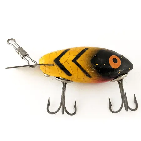 Gele lak met duidelijke zwarte chevrons bedekt deze houten body, wat een klassiek tijdperk van Amerikaanse kunstaasproductie vertegenwoordigt. Met een lengte van 6 cm en een gewicht van 7 g draagt dit Bomber-model productcode 12475 en stamt het uit de productieperiode 1949-1970. De afwerking vertoont fijne, zichtbare haarscheurtjes over de gele en zwarte delen, wat resulteert in een conditiescore van 4/5 terwijl de authentieke vintage uitstraling behouden blijft. Een opvallend oranje oog met een zwarte pupil bevindt zich op het donker geschilderde kopgedeelte, wat een contrastrijk mikpunt vormt voor vissoorten zoals snoek, baars en roofblei. Dit drijvende kunstaas is ontworpen om bij het binnenvissen een diepte van 2,0 m te bereiken. De montage bestaat uit twee op de buik gemonteerde dreggen en een metalen lijnbevestiging die aan de achterzijde is bevestigd.