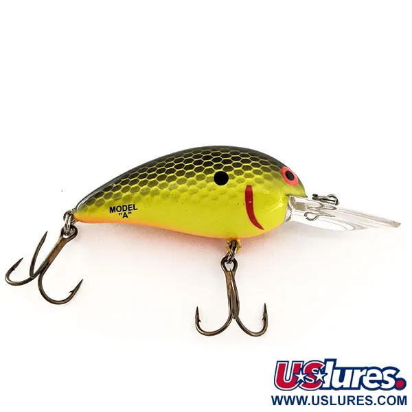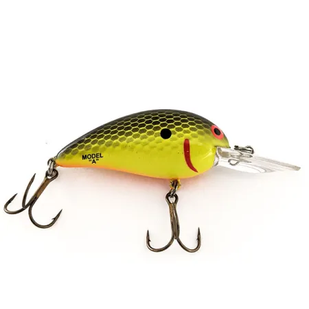 Schubben in een donker honingraatpatroon gaan over in een heldere chartreuse flank op deze 5,5 cm (2 1/4") crankbait. Herkenbaar aan de klassieke Model "A"-stempel en productcode 11853, is dit specifieke Bomber B04A UV-exemplaar voorzien van een gespecialiseerde afwerking die oplicht onder ultraviolet licht. Met een gewicht van 8 g (1/4 oz) wordt het lichaam geaccentueerd door een duidelijke rode streep bij de kop en een levendig rood oog. De heldere duiklip is ontworpen om dieptes tussen 0,9 en 2,1 m (3-7 ft) te bereiken, waardoor het een veelzijdige keuze is voor zowel werpend vissen als trollen. Dit kunstaas verkeert in uitstekende staat, beoordeeld met 5/5, met de originele bronskleurige dreggen stevig bevestigd. De lichtgevende eigenschappen zijn bijzonder nuttig bij het vissen op snoek of snoekbaars in troebel water of tijdens perioden met weinig licht.
