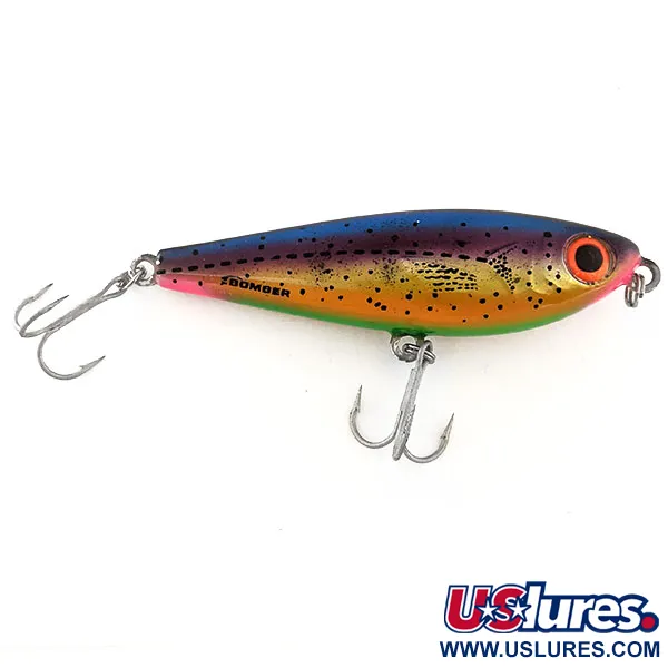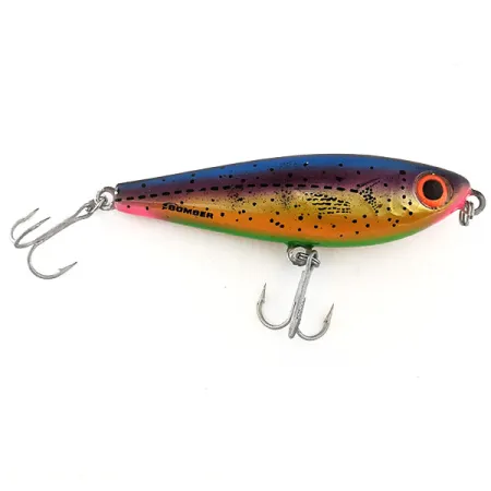 Gedompeld in het klassieke Rainbow Trout-palet, toont dit exemplaar een levendige overgang van paars naar blauw op de rug, die overgaat in een goudgele flank bezaaid met fijne zwarte stippen. Met een gewicht van 1/2 oz (14 g) en een lengte van 3 1/2" (9 cm) is hij gebouwd voor afstand bij het vissen op snoek of baars aan de oppervlakte. De aanduiding "Low Pitch" verwijst naar de interne akoestiek die is ontworpen om een diep geluid te produceren, wat een ander geluidsprofiel biedt dan traditionele hoogfrequente ratels. Een opvallend oog met een oranje rand zorgt voor een contrastrijk focuspunt tegen de metalen kop. Voorzien van productcode 11384, is het kunstaas gestempeld met de naam Bomber op de zijkant en behoudt het zijn originele hardware. In de 5/5 conditie blijft de lak glanzend en zijn de dreggen schoon, wat de duurzame constructie van dit in de VS gemaakte kunstaas aantoont. Een subtiel roze accent langs de onderbuik maakt het realistische forelimitatiesprofiel compleet.