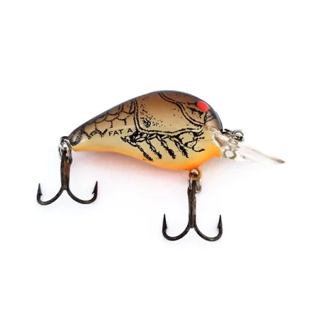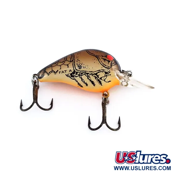 Uitgevoerd in het CBB-kleurpatroon, beschikt deze compacte ultralichte plug over een zandkleurig lichaam met een donkere kreeft-tekening en een feloranje buik. Met een lengte van 3 cm (1 1/4") en een gewicht van 2 g (1/16 oz) is dit een gespecialiseerd instrument voor de visserij op baars en kopvoorn. De transparante duiklip is ontworpen om dieptes te bereiken tussen 1,2 m (3,9 ft) en 1,8 m (5,9 ft) tijdens een standaard inhaalbeweging. Dit in de USA gemaakte model, gecatalogiseerd onder productcode 9961, vertoont de modelnaam "FAT A" duidelijk op de zijkant. Twee donker afgewerkte dreggen zijn bevestigd met robuuste splitringen, passend bij de uitstekende algehele staat. Opvallende rode ogen zijn net boven de lip geplaatst en vormen een scherp contrast met het donkerbruine verloop op de kop en rug.