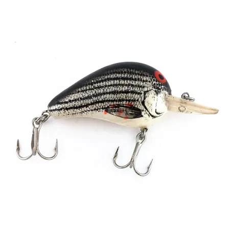 Versierd mit een klassiek gestreept schubbenpatroon en opvallende rode ogen, is dit exemplaar van 4 cm (1 1/2") een vaste waarde in de light-cranking categorie. Met een gewicht van 5,5 g (3/16 oz) beschikt de Bomber Fat A B04F, herkenbaar aan productcode 9549, over een compact en breed profiel dat is ontworpen voor het werpen op soorten zoals baars en kopvoorn. Het kleurenschema toont een donkere rug die overgaat in zilveren flanken met nauwkeurige horizontale lijnen om kleine aasvisjes te imiteren. De heldere, afgeronde duiklip is ontworpen om dieptes tussen 1,2 - 1,8 m (4-6 ft) te bereiken, wat zorgt voor een betrouwbare presentatie in het middensegment. De hardware bestaat uit twee originele dreggen die zijn bevestigd met stevige splitringen. Dit in de VS gemaakte kunstaas verkeert in 5/5 conditie, met een schone afwerking op de witte buik en de gedessineerde flanken.