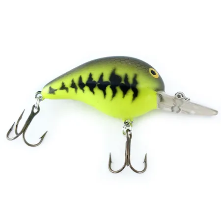 De Baby Bass-afwerking op dit 5 cm (2") kunstaas zorgt voor een opvallend hoog-contrast profiel dat in verschillende wateromstandigheden goed zichtbaar is. Deze Bomber Fat A B05F, herkenbaar aan productcode 11084, is een klassieke in de USA gemaakte drijvende crankbait met een gewicht van 10 g (1/3 oz). Het model is voorzien van een stevige, geïntegreerde transparante duiklip die is ontworpen om het aas naar een werkdiepte van 1,8-2,4 m (6-8 ft) te brengen, waardoor het een betrouwbare keuze is voor het vissen op baars of kopvoorn. Dit exemplaar verkeert in een uitstekende staat (5/5) met de originele lak en hardware in topconditie. Het kleurpatroon verloopt van een donkerolijfkleurige rug naar heldere chartreuse zijkanten, geaccentueerd door het kenmerkende donkere vlekkenpatroon op de flanken. Twee scherpe dreggen zijn met standaard splitringen aan de buik en staart bevestigd. De extra grote gele ogen zijn kenmerkend voor deze serie en vormen een duidelijk mikpunt aan de voorzijde van het lichaam.