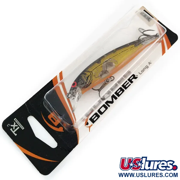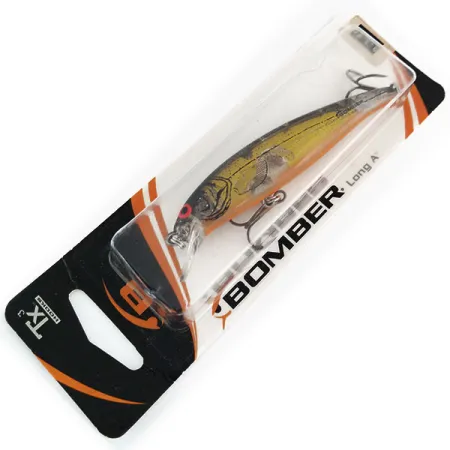 Met een lengte van precies 9 cm (3 1/2") blijft het slanke profiel van deze klassieke jerkbait een vaste waarde voor sportvissers die jagen op alles van snoekbaars tot baars. Dit specifieke model, productcode 9809, is uitgevoerd in het XCHO-kleurenschema: een goudgeel lichaam met donkere verticale strepen en een opvallend rood oog. Met een gewicht van 9,5 g (1/3 oz) is het kunstaas ontworpen voor veelzijdigheid in de waterkolom; het bereikt dieptes van 0,6 - 0,9 m bij het werpen, of diepere zones van 1,2 - 2,4 m tijdens het trollen. De vintage verpakking geeft aan dat dit exemplaar is geassembleerd in Mexico en is uitgerust met Tx3-haken. Dit exemplaar is ongebruikt en zit nog in de originele blisterverpakking, waardoor de Bomber Lures-branding uit 2004 en de heldere, vierkant gesneden duiklip behouden zijn gebleven. Het is een goed onderhouden exemplaar van de B14A-serie, geschikt voor de visserij op forelbaars, baars en gestreepte bas.