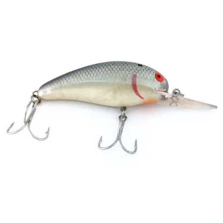 Het schubbenpatroon op de rug gaat over in een gladde, crèmekleurige buik op deze Bomber Model A 67, een klassiek voorbeeld van Amerikaans vakmanschap. Met een gewicht van 14 g (1/2 oz) en een lengte van 6,7 cm (2 3/4") is deze drijvende plug uitgerust met een heldere duiklip die is gebouwd om dieptes van 2,4 tot 3,0 m (8 tot 10 ft) te bereiken. Het visuele profiel wordt geaccentueerd door een felrode kieuwstreep en opvallende rode ogen met zwarte pupillen, wat een focuspunt vormt tegen het zilvergrijze schubbenpatroon. Onder productcode 10834 dient het interne ratelmechanisme als auditieve aantrekkingskracht tijdens zowel het werpen als het trollen. Dit exemplaar verkeert in uitstekende staat, beoordeeld met 5/5, met goed bewaarde hardware en lak.