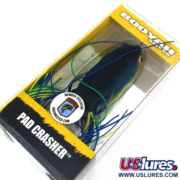 Een diepblauw-zwarte rug loopt over in een felgele buik op deze 14 g (1/2 oz) hollow-body kikker. De Booyah Pad Crasher, herkenbaar aan productcode 10841, is gemaakt voor het vissen in zware begroeiing en tussen de waterlelies. De meerkleurige siliconen skirt is voorzien van blauwe, groene en gele strengen, ontworpen om de poten van een zwemmende amfibie na te bootsen. Dit exemplaar is ongebruikt in de originele geel-zwarte Booyah Bait Co. verpakking, met een kenmerkende "Member Exclusive B.A.S.S." sticker op het plastic venster. Een paar scherpe, omhoogstaande dubbele haken liggen vlak tegen het zachte lichaam om vastlopen te voorkomen, maar klappen direct in bij een aanbeet. Het profiel van 6 cm (2 1/4") behoudt een compacte aanwezigheid die overeenkomt met natuurlijk aas. Kleine oranje ogen zorgen voor een subtiel contrast tegen de donkere kop van het kunstaas. De interne verzwaring is zo geplaatst dat het lichaam correct op het wateroppervlak landt, waarbij de haakpunten naar boven gericht blijven.