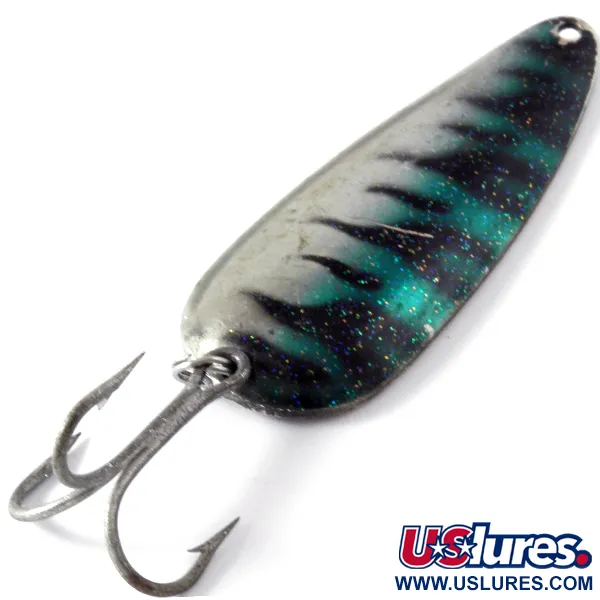 Het Green Tiger-patroon met donkere verticale strepen op een glanzende nikkelbasis bepaalt de uitstraling van deze in de VS gemaakte lepel. Met een gewicht van 19 g (2/3 oz) en een lengte van 7 cm (2 3/4") draagt deze Boss Lures Boss Spoon productcode 4086 en bevat fijne veelkleurige glitters in de groenblauwe en zwarte lak. De achterkant is afgewerkt met gepolijst nikkel voor een hoog flitscontrast. Voor de verzamelaar verkeert dit exemplaar in een staat van 4/5, met lichte oppervlakkige krassen en gebruikssporen passend bij de leeftijd. Een stevige dreg is bevestigd via een splitring aan de staart, terwijl het bovenste oog klaar is voor een speld of onderlijn.