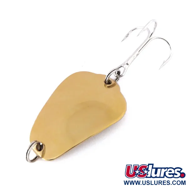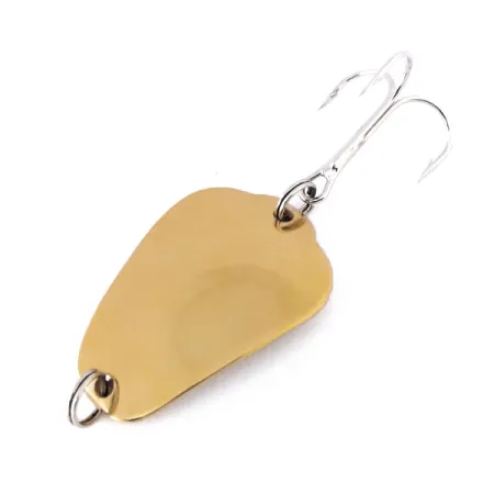 Met een lengte van 4 cm (1 1/2") glanst het gestanste metalen lichaam van dit exemplaar met een gepolijste gouden afwerking. Deze Bug-Spoon van Tony Accetta is een klassieker van het Amerikaanse hengelsportontwerp uit het midden van de vorige eeuw, specifiek verzwaard op 14 g (1/2 oz) voor verre worpen. De vergulding is opmerkelijk goed bewaard gebleven op het bladvormige silhouet, dat op de achterkant de duidelijke stempel "BUG-SPOON" draagt. Als ongebruikt kunstaas met een conditiescore van 6 behoudt de lepel zijn oorspronkelijke glans zonder tekenen van gebruik of ouderdom. Onder productcode 10595 bestaat de hardware uit heavy-duty splitringen aan zowel de neus als de staart, waarbij de laatste een grote, glanzend zilverkleurige dreg vasthoudt. De uitvoering is solide en compact en weerspiegelt de productienormen van de Amerikaanse herkomst.