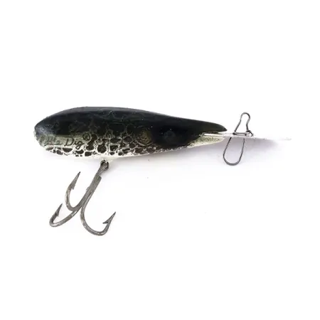 Zwaarder dan hij lijkt met 7 g (1/4 oz), de solide rubberen body van dit exemplaar is een kenmerk van het werk van de Burke Flexo-Products Company uit het midden van de 20e eeuw. Voorzien van productcode 10129, heeft het kunstaas een contrastrijk zwart-wit gevlekt patroon dat opvalt in het water. Een stevige metalen duiklip is aan de voorzijde bevestigd om het drijvende rubberen lichaam omlaag te trekken tijdens het binnenvissen. Met een lengte van 6 cm (2 1/4") draagt de body nog steeds de originele 'Big Dig' en 'Burke' stempels op de zijkanten. Het beslag vertoont lichte gebruikssporen, wat resulteert in een conditiescore van 3/5. Een enkele dreg is stevig onder de buik gemonteerd, waardoor dit een compleet stukje hengelsportgeschiedenis uit Michigan is.