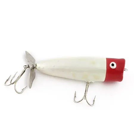 Een klassiek red head-patroon kenmerkt dit exemplaar, met een opvallende rode voorkant tegen een parelmoerwit rubberen lichaam. Met een gewicht van 1/2oz (14g) en een lengte van 2 3/4" (7cm) vertegenwoordigt dit oppervlakteaas van de Burke Flexo-Products Company het unieke tijdperk van in Michigan geproduceerd rubber kunstaas tussen 1950 en 1993. De zachte constructie van productcode 23204 is ontworpen voor het poppen aan het oppervlak, voorzien van een holle mond en een kenmerkende metalen propeller aan de achterzijde voor extra waterverplaatsing. Een enkele dreg op de buik wordt aangevuld met een tweede dreg die achter de staartspinner hangt. De geschilderde ogen zijn goed bewaard gebleven en de algehele staat van 4/5 laat zien dat het rubber soepel is gebleven, met slechts lichte oppervlakkige sporen die passen bij de leeftijd. Burke stond bekend om deze "live action" ontwerpen, waarbij de nadruk lag op een tactiele ervaring die sterk verschilde van de harde kunststoffen van andere fabrikanten uit die tijd.