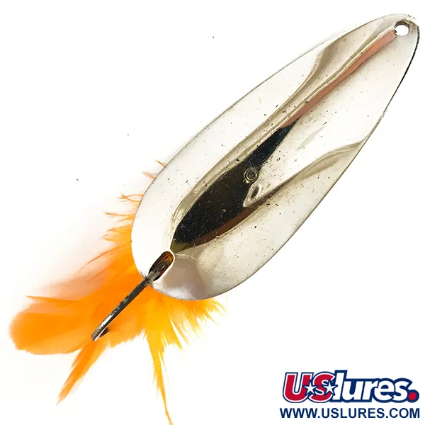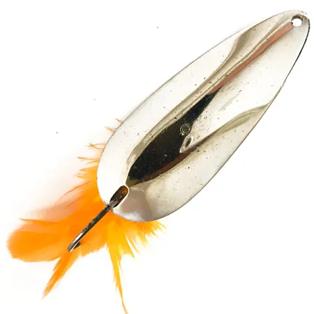 Gestempeld met de namen 'ACCETTA' en 'Weed-Dodger', valt deze vernikkelde lepel op als een klassiek voorbeeld van mid-century anti-wier ontwerp. Een gewicht van 2/3oz (19g) maakt hem substantieel voor zijn 2 1/2" (6,5cm) frame. Het gepolijste nikkeloppervlak reflecteert licht efficiënt, terwijl een levendige pluk oranje veren aan de enkele haak is gebonden om een visueel focuspunt te bieden. De Weed-Dodger is voorzien van een gespecialiseerde draadbeschermer die ontworpen is om leliebladen en zware vegetatie weg te leiden van de haakpunt, wat het werpen in dichte begroeiing vergemakkelijkt. Met een score von 5/5 toont het kunstaas een indrukwekkend schone afwerking met scherpe belettering. In de database geïdentificeerd onder productcode 3607, vertegenwoordigt het de praktische vindingrijkheid die Tony Accetta naar de hengelsportindustrie bracht. Een stevige enkele haak is direct in het lichaam geïntegreerd, vastgezet met een schroefplaat die ook de metalen wierbeschermer verankert.