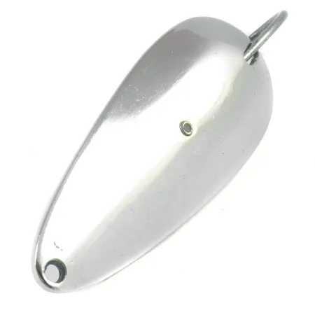 Gepolijst tot een hoogglans nikkelafwerking, vertegenwoordigt deze 5,5 cm (2 1/4") lepel een klassieker van het Amerikaanse wierloze kunstaasontwerp uit het midden van de vorige eeuw. Met een gewicht van 10 g (1/3 oz) maakt de Tony Accetta Weed Doger, herkenbaar aan productcode 3211, gebruik van een robuuste enkele haak die direct in de concave buik is geïntegreerd. De haak wordt vastgezet door een kenmerkende schroef die ook de draadvormige wierbeschermer verankert, een functie ontworpen voor het werpen in leliebladen en dichte vegetatie. Aan de binnenzijde zijn de merktekens 'TONY ACCETTA' en 'WEED DOGER' duidelijk ingestanst, wat de herkomst uit de USA bevestigt. Dit exemplaar verkeert in 5/5 conditie, met een spiegelend oppervlak over het druppelvormige lichaam. Het smalle uiteinde is voorzien van een nauwkeurig geboord gat voor de lijnbevestiging, terwijl het brede uiteinde de basis vormt voor de vaste haakmontage.