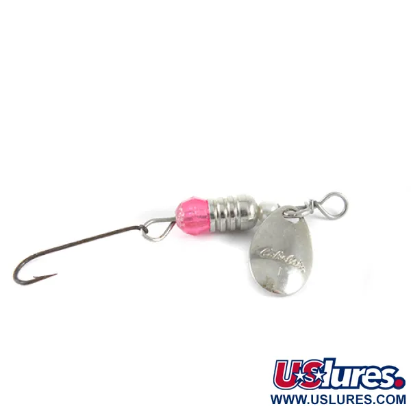De merknaam Cabela's en de maat "1" zijn duidelijk in het druppelvormige nikkelen blad gestanst, wat de herkomst van dit kunstaas markeert bij een iconische naam uit de Amerikaanse hengelsportgeschiedenis. Met een gewicht van 2,5 g (3/32 oz) en een lengte van 6 cm (2 1/4") heeft deze inline spinner een klassieke opbouw met een felroze facetkraal en een gegroefd nikkelen gewichtje. Een kleine witte afstandskraal naast de beugel zorgt voor een subtiel visueel contrast met de gepolijste metalen onderdelen. Aan het draadframe is een enkele haak met lange steel bevestigd, een configuratie die vaak wordt gebruikt om de vis makkelijker te onthaken of op wateren met specifieke regels. Dit in de VS gemaakte exemplaar, herkenbaar aan productcode 1540, heeft een zachte, authentieke uitstraling op de metalen oppervlakken en verkeert in een staat van 4/5.