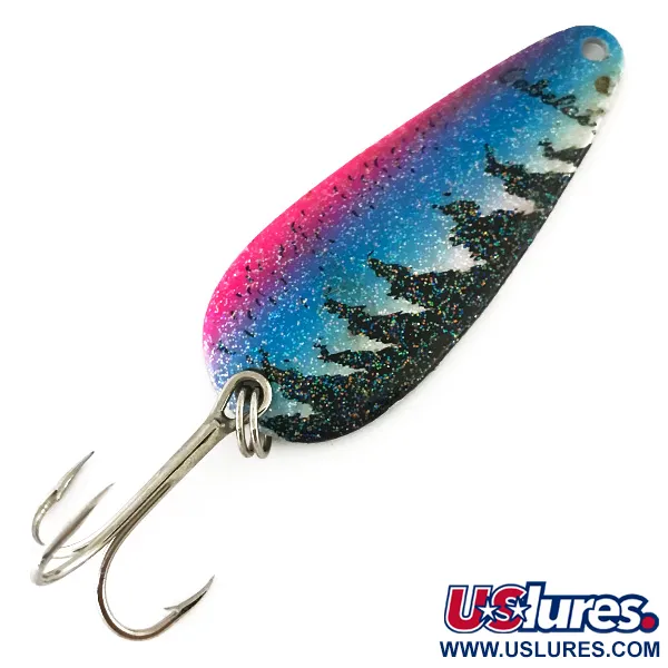 Een gewicht van 12 g geeft deze lepel de nodige dichtheid voor verre worpen in diep water of door rivierstromingen. Het Forel-kleurenschema is visueel opvallend, met een levendig neonroze en blauw kleurverloop dat zwaar is geaccentueerd met veelkleurige glitters. Langs de rand van het 5,5 cm lange lichaam zorgen zwarte silhouetten van naaldbomen voor een contrastrijk detail tegen de glinsterende achtergrond. Op de kop van het kunstaas is de merknaam Cabela's in een strak, zwart lettertype gedrukt. De achterkant van de lepel is afgewerkt in schitterend gepolijst zilver, bedoeld om een felle flits te creëren die contrasteert met de geverfde voorkant. Dit in de VS gemaakte exemplaar, vermeld onder productcode 8517, is uitgerust met een duurzame splitring en een scherpe dreg. Met een score van 5/5 verkeert het kunstaas in uitstekende staat met een afwerking die glanzend en intact blijft.