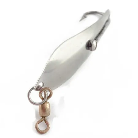 De vernikkelde laag biedt een heldere, reflecterende basis voor deze Capt Action 5 uit de jaren 50, een in de VS geproduceerde lepel ontworpen voor het vissen in dichte begroeiing. Met een lengte van 9 cm is het langwerpige lichaam voorzien van een wiervrije haakconstructie, waarbij een enkele grote haak wordt beschermd door een metalen wiertik en met een opvallende klinknagel aan de body is bevestigd. Dit exemplaar, bekend onder productcode 23564, weegt 12 gram en heeft een glanzende, uitstekend geconserveerde afwerking over het gehele oppervlak. De conditie is gewaardeerd op 5/5, wat de hoge mate van bewaring voor een vintage stuk kunstaas uit dit tijdperk weerspiegelt. Voor de montage is de lepel uitgerust met een messingkleurige tonwartel die via een stevige splitring aan de neus is bevestigd; een gangbare keuze van Amerikaanse fabrikanten uit het midden van de vorige eeuw om het kinken van de lijn tegen te gaan. Het gestroomlijnde profiel en de solide metalen constructie zijn karakteristiek voor de functionele benadering van Captain Action op het gebied van ontwerp van hengelsportmateriaal.