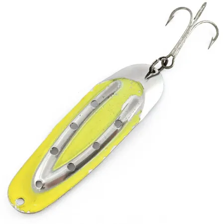 Heldergele lak vult de V-vormige gestempelde groef van deze 8 cm lange lepel, wat zorgt voor een opvallend contrast tegen de gepolijste nikkelen afwerking. Rustowicz produceerde dit Charger №3-model, herkenbaar aan productcode 22103, in de VS met een kenmerkend geperforeerd ontwerp met zes ronde gaten langs de verhoogde randen. Deze perforaties zijn ontworpen om de waterweerstand en druk te beïnvloeden tijdens het gelijkmatig binnenvissen. Met een gewicht van 12,5 g is het kunstaas uitgerust met een robuuste dreg die via een enkele splitring aan de achterzijde is bevestigd. Dit exemplaar verkeert in een zeer goed bewaarde staat, beoordeeld op 4/5, waarbij het gele emaille en de nikkelen plating slechts lichte sporen van zijn vintage status vertonen. Een enkel bevestigingspunt aan de kop maakt het mogelijk om de lijn direct te knopen of een speldwartel te gebruiken voor diverse werpopstellingen.
