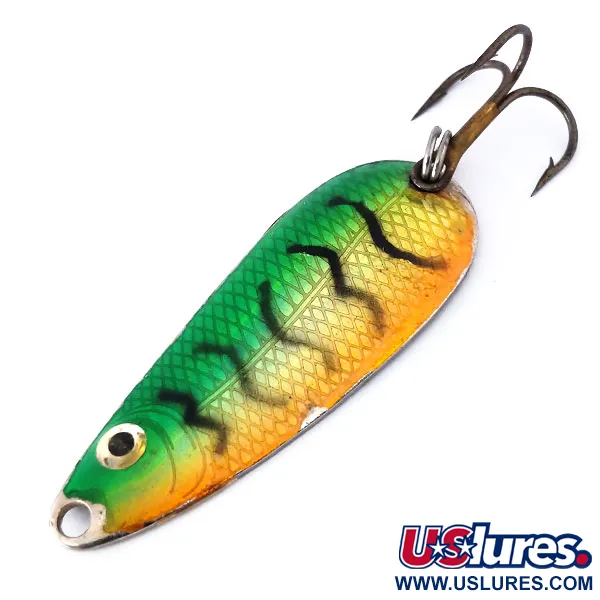 Afgewerkt met een levendige Rainbow Perch-lak, weerspiegelt deze metalen lepel van 9 g (1/3 oz) de klassieke ontwerpprincipes van vintage Amerikaans hengelsportmateriaal. Het profiel van 5,5 cm (2 1/4") toont een reliëfschubbenpatroon dat het licht vangt onder de groene en oranje tinten. Een goud met zwart geschilderd oog bij de neus vormt een natuurgetrouw mikpunt voor roofvissen. Deze Wahoo Class Tackle lepel, bekend onder productcode 10468, heeft een blanke metalen achterzijde met lichte ouderdomsplekjes, wat hem een conditiescore van 4/5 oplevert. Stevige hardware, waaronder een sterke splitring en dreg, maakt dit in de VS geproduceerde kunstaas klaar voor het werpen naar begroeiing of het trollen bij diepe structuren.
