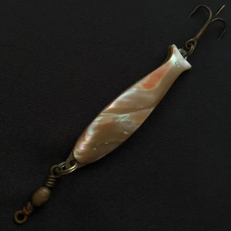 Met een lengte van 7 cm toont deze Compac lepel het vakmanschap van de Japanse hengelsportproductie uit het midden van de vorige eeuw door het gebruik van een massief stuk iriserend parelmoer. De natuurlijke schelp is zorgvuldig gevormd om bij het visachtige profiel van het kunstaas te passen en is met twee zichtbare klinknagels verankerd aan de zilverkleurige metalen basis. Met een gewicht van 14 g biedt het model 19657 voldoende massa voor zowel verre worpen als diep trollen. De metalen achterzijde is gepolijst en glad, wat fraai contrasteert met de organische glans van de parelmoerinleg. Wat betreft het beslag is het kunstaas uitgerust met een stevige tonwartel aan de neus en een bronzen dreg aan de staart. Dit specifieke exemplaar verkeert in een uitstekende staat, wat een beoordeling van 5/5 rechtvaardigt. De Japanse herkomst weerspiegelt een periode waarin Compac bekend stond om het importeren van uniek gedecoreerde lepels die esthetiek combineerden met functionele duurzaamheid.