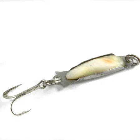 Natuurlijk parelmoer en gepolijst nikkel komen samen in dit vintage Compac kunstaas, dat de klassieke Japanse productiestijl laat zien. Met een gewicht van een delicate 2,2 g (1/16 oz) meet het exemplaar 3 cm (1 1/4"). De parelmoer inleg wordt stevig tegen het metalen lichaam gehouden door omgevouwen lipjes, wat een zachte, organische glans geeft als aanvulling op de reflecterende metalen achterkant. Met een conditiescore van 4/5 blijft de lepel helder en schoon, met de enkele dreg aan de achterzijde en de splitring volledig intact. Dit ontwerp met productcode 3087 was bedoeld voor finesse-toepassingen waarbij de flits van nikkel en de diepe glans van schelp het meest effectief zijn.