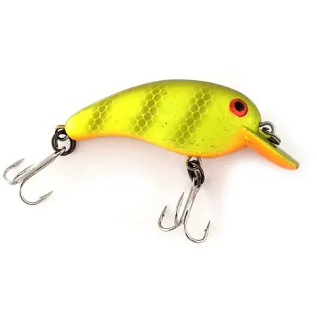 Een felgele lak met een klassiek honingraat schubbenpatroon definieert de afwerking van deze compacte 4 cm (1 1/2") crankbait. Met een gewicht van 4 g (1/8 oz) is deze Cotton Cordell Big O een schoolvoorbeeld van de 11219-productcode, voorzien van de kenmerkende square lip die is ontworpen om te vissen op dieptes tot 0,9 m (3 ft). Het levendige gele lichaam wordt aangevuld met een subtiele oranje buik en opvallende rood-zwarte ogen, een kleurenschema dat vaak favoriet is voor het vissen op baars, roofblei en snoek in verschillende wateromstandigheden. Dit in de VS gemaakte exemplaar verkeert in uitzonderlijke staat en heeft een score van 5/5 verdiend voor het schone oppervlak en het intacte beslag. Twee scherpe dregmaken zijn beveiligd met stevige splitringen, klaar om in ondiepe dekking te worden geworpen. Het korte, gedrongen lichaamsprofiel van de Big O hielp de moderne categorie van ondiep duikende crankbaits te definiëren.