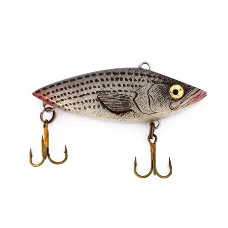 Met een levensecht gestreept patroon dat een jonge witte baars nabootst, is deze 9g (1/3oz) Cotton Cordell Hot Spot een opvallend stukje Amerikaanse hengelsportgeschiedenis. Met een lengte van 6 cm (2 1/4") heeft het kunstaas een klassiek lipless profiel met een platte neus en een lijnbevestiging aan de bovenzijde, ontworpen om op verschillende dieptes te vissen. Het schilderwerk op dit exemplaar, geïdentificeerd met productcode 10264, is opmerkelijk scherp gebleven, met duidelijke zwarte horizontale stippen en een felgeel oog dat een duidelijk mikpunt vormt voor roofvissen. De aandacht voor detail van Cotton Cordell is zichtbaar in het subtiele rode accent onder de kin en het zilver-naar-grijs verloop over de rug. De hardware bestaat uit twee originele bronzen dreggen, die schoon en goed bevestigd zijn. Met een conditiescore van 5/5 is de afwerking uitzonderlijk goed bewaard gebleven zonder zichtbare slijtage, waardoor het een uitstekend exemplaar is voor het vissen op snoekbaars, snoek, forel of zalm, zowel bij het werpen als bij het trollen.