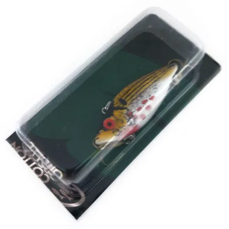 Versierd met een opvallend patroon van gedurfde verticale strepen over een gouden rug, gaat dit exemplaar over in een witte buik gemarkeerd met duidelijke rode stippen. Geïdentificeerd door productcode 9743, heeft deze 1/4 oz (7 g) Super Spot een levendig rood oog dat dient als middelpunt tegen de geelgetinte kop. Het kunstaas is 2 1/4" (5,5 cm) lang en zit nog in de originele verpakking; met conditie 6 is het volledig ongebruikt en precies bewaard zoals het de fabriek verliet. Cotton Cordell ontwierp deze zinkende, ratelende liploze plug voor verschillende technieken, waaronder werpen en trollen op variabele diepte. Deze veelzijdigheid maakt het een essentieel onderdeel voor het vissen op soorten variërend van baars en snoek tot forel en zalm. De Super Spot-lijn is belangrijk in de geschiedenis van het merk, aangezien Cotton Cordell hielp de categorie liploze crankbaits te pionieren met ontwerpen als deze, geworteld in hun oorsprong in Hot Springs, Arkansas. De dreg en ringen zitten veilig in de blisterverpakking, waardoor de afwerking en componenten in onberispelijke staat blijven.