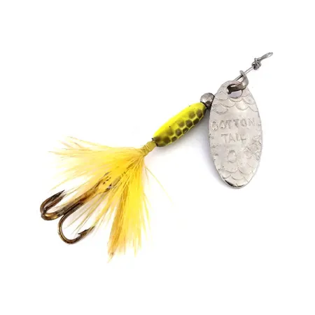 Het gestempelde nikkelen blad is voorzien van een subtiel schubbenpatroon naast het "COTTON TAIL" merkteken. Deze 1,7 g (1/16 oz) inline spinner is een klassieker van Cotton Cordell voor baars en forel, gemaakt in de VS. Het gele loodlichaam met donkere stippen gaat over in een felgele gevederde dreg voor een natuurlijk profiel. Met een totale lengte van 5,08 cm (2") verkeert dit exemplaar in 5/5 staat, waarbij de originele onderdelen en afwerking behouden zijn. Verzamelaars herkennen de variant Nikkel/Geel aan code 10138. De beugel houdt het blad van de as af voor een optimale rotatie tijdens het binnenvissen.