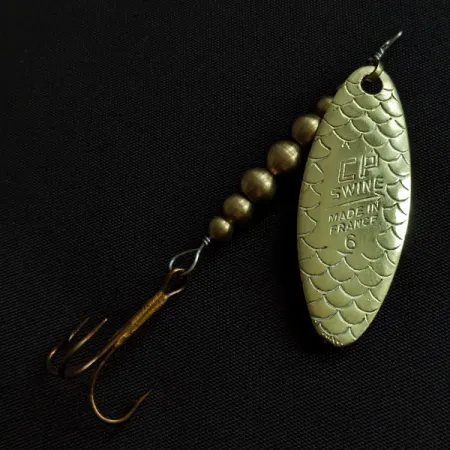 Messingkleurige oppervlakken kenmerken deze 1/4oz (8g) inline spinner, een iconisch ontwerp uit de Franse hengelsportindustrie. Het blad is voorzien van een gedetailleerd schubbenpatroon rondom de stempels "CP SWING" en "MADE IN FRANCE". Onder deze markeringen geeft het getal "6" de specifieke modelmaat binnen de serie aan. Met een lengte van 7 cm vanaf het bovenste oogje tot aan de bocht van de haak, maakt het kunstaas gebruik van een reeks van zes bolvormige messing kralen als verzwaarde body. Dit specifieke exemplaar, herkenbaar aan productcode 20771, verkeert in conditie 5/5, waarbij de metalen oppervlakken en het beslag uitstekend bewaard zijn gebleven. De staaldraadconstructie is nog kaarsrecht en eindigt in een stevige dreg.