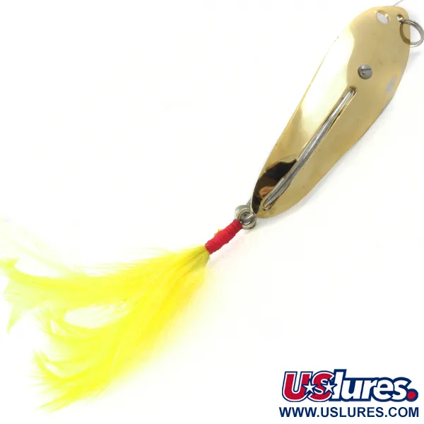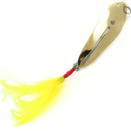 Een hooggepolijste gouden afwerking bedekt het gestanste lichaam van deze Crippled Alewive kunstaas, geregistreerd onder productcode 4137. Met een gewicht van 35g (1 1/4 oz) maakt de lepel gebruik van een specifiek weedless ontwerp, inclusief een beschermende draad om de punt van de haak af te schermen van zware vegetatie. Het frame van 10cm (4") valt op door zijn offset geometrie en een ongebruikelijke tweede haakopstelling verborgen onder de gele verendressing. Deze levendige gele veren zijn stevig aan de staart gebonden met felrode draad, wat zorgt voor een opvallend profielcontrast tegen het metalen gouden oppervlak. Het metaalwerk, inclusief de met schroeven bevestigde haakconstructie en de bovenste splitring, ziet er glanzend en goed onderhouden uit, zonder tekenen van eerder gebruik. Deze specifieke constructie van Crippled Alewive Lure richt zich op duurzaamheid voor het werpen in dichte begroeiing.