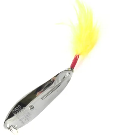 De gepolijste nikkelen afwerking vangt het licht op deze 6,5 cm (2 1/2") lepel, wat het kenmerkende wiervrije ontwerp benadrukt. Met een gewicht van 12,5 g (2/5 oz) heeft de Crippled Alewive kunstvleugel een ongebruikelijke bouwwijze met een gespecialiseerde montagenop aan de binnenzijde van de lepel. De enkele haak wordt beschermd door een metalen wierbeschermer en is versierd met een levendige gele verenteaser, vastgezet met een strakke wikkeling van rode draad bij het oog. Aan de holle kant van het metaal is de naam "CRIPPLED ALEWIVE" duidelijk gestempeld, samen met de herkomst USA, een kenmerk van Amerikaanse fabricage uit het midden van de vorige eeuw. Dit specifieke exemplaar, geïdentificeerd door productcode 4138, verkeert in een 5/5 conditie, met zeer schone oppervlakken op de beplating. De combinatie van het reflecterende lichaam en de bevederde trailer is ontworpen voor sportvissers die op roofvis jagen in dichte vegetatie.