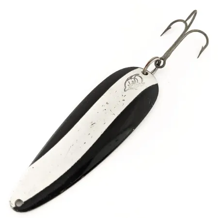 Een opvallende zwart-witte diagonale streep kenmerkt de voorzijde van deze 28 g (1 oz) Eppinger klassieker, een kleurenschema dat door veel ervaren sportvissers wordt gewaardeerd vanwege het hoge contrast in verschillende lichtomstandigheden. Met een lengte van 9 cm (3 1/2") is deze Dardevle (Productcode 11461) voorzien van het iconische duivelskop-logo dat in het metaal op de voorzijde is gestempeld, een teken van het vakmanschap uit Detroit waarmee Lou Eppinger meer dan een eeuw geleden in zijn kelder begon. De achterzijde toont een strakke nikkelen afwerking, duidelijk gestempeld met de naam 'DARDEVLE' en 'MADE IN USA', wat de lange productiegeschiedenis van het merk in Michigan weerspiegelt. Dit exemplaar verkeert in 5/5 conditie, met scherpe verflijnen en gepolijst metaal. De zware constructie is gecombineerd met een vintage-stijl dreg en een robuuste splitring, ontworpen voor verre worpen of trollen bij gematigde snelheden.