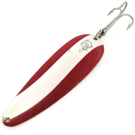 De stempel "DARDEVLE DETROIT, U.S." op de gepolijste nikkelen achterzijde koppelt dit exemplaar aan de vroege geschiedenis van de legendarische fabrikant uit Michigan, vóór hun verhuizing naar Dearborn in 1959. Deze Eppinger Dardevle, herkenbaar aan productcode 12981, is voorzien van het iconische diagonaal rood-wit gestreepte patroon op de bolle zijde. Met een gewicht van 28g (1oz) en een lengte van 9cm (3 1/2") is het een forse lepel, ontworpen voor het werpen of trollen op grotere zoetwaterrovers. Het kenmerkende duivelskoplogo is duidelijk zichtbaar op de zilveren banen, wat het markeert als een authentiek stuk Amerikaans vakmanschap. Dit kunstaas verkeert in uitstekende staat, beoordeeld met 5/5, met helder emaille en schone metalen oppervlakken. Een grote dreg in originele stijl is bevestigd via een zware splitring aan de brede zijde, terwijl het enkele oogje aan de smalle punt vrij en scherp blijft. Dit ontwerp is zo effectief dat soortgelijke modellen ooit deel uitmaakten van overlevingspakketten voor de luchtmacht van de Amerikaanse overheid.