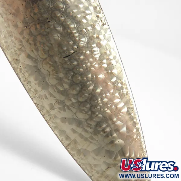 Een glinsterende gehamerde zilveren afwerking kenmerkt dit exemplaar van 1 oz (28 g), met de klassieke "Crystal" zilveren schubbenstructuur. Met een lengte van 9 cm (3 1/2") draagt deze Eppinger Dardevle (productcode 1605) de diepgestempelde historie op de concave onderzijde, duidelijk gemarkeerd met de herkomst uit Detroit, U.S.A. Het metalen oppervlak blijft glanzend en reflecteert het licht over de getextureerde facetten, bedoeld voor een duidelijke waggelende actie tijdens een gelijkmatige inhaalbeweging. Wat betreft het beslag, de splitring houdt een stevige dreg veilig vast. De conditie is gewaardeerd op 4/5, met slechts kleine contactsporen op het oppervlak die geen afbreuk doen aan de hoogglans afwerking. Dit exemplaar heeft het karakteristieke langwerpige druppelprofiel dat het merk tot een vaste waarde heeft gemaakt sinds de begindagen van Lou Eppinger. De achterkant van de lepel is afgewerkt in een gepolijste nikkeltoon, wat de leesbare makerskenmerken en de iconische branding die in het metaal is gestempeld, benadrukt.
