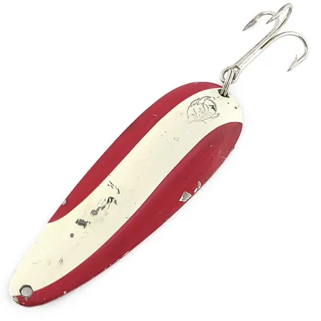 Met een solide gewicht van 28g (1oz) is deze klassieke lepel voorzien van de zware metalen constructie die het merk sinds 1906 tot een vaste waarde in de viskoffers van Michigan heeft gemaakt. Het lichaam van 9 cm (3 1/2") is afgewerkt in het kenmerkende Red Devle-patroon, een opvallende rode basis met een duidelijke witte diagonale streep over de bolle zijde. Op de zilverkleurige, holle binnenzijde is het authentieke "DARDEVLE DETROIT. U.S.A." stempel duidelijk zichtbaar, wat dit exemplaar identificeert als een product uit de vroege productiegeschiedenis van Eppinger. Onder productcode 23164 toont dit kunstaas het karakter van een ervaren veteraan met een conditiescore van 3,5/5, wat zich uit in verspreide lakschade en slijtage langs de randen door eerder gebruik. De montage omvat een duurzame zilveren splitring bevestigd aan een robuuste dreg, klaar voor het werpen of trollen. Het originele logo met de duivelskop is nog zichtbaar bij het bevestigingsoog, een detail dat vervaardigd is met de eigen matrijzen van het bedrijf. Dit specifieke gewicht en het langwerpige profiel zijn ontworpen om diepere waterlagen te bereiken waar grotere roofvissen zich vaak ophouden.