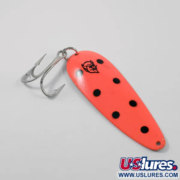 Met een gewicht van 28g (1oz) is deze vintage werplepel een klassiek stukje hengelsportgeschiedenis uit Detroit, Michigan. De voorzijde heeft een opvallende felroze afwerking, versierd met zeven zwarte stippen en het iconische Eppinger duivelslogo. De lepel is 9 cm (3 1/2") lang en is op de gepolijste nikkelen achterkant gestempeld met "DARDEVLE DETROIT USA", wat de authentieke fabricage bevestigt. Dit exemplaar, geregistreerd onder productcode 2695, verkeert in 5/5 staat, met behoud van de glanzende lak en scherpe belettering op het metaal. Het beslag bestaat uit een stevige dreg bevestigd met een extra sterke splitring, ontworpen voor grote zoetwaterrovers zoals snoek of muskie. Lou Eppinger's kenmerkende vormgeving is duidelijk zichtbaar in het diepe concave profiel, een ontwerpelement dat sinds de beginjaren van het bedrijf nagenoeg ongewijzigd is gebleven. Het contrast tussen de levendige roze bovenkant und de reflecterende nikkelen achterkant zorgt voor zichtbaarheid onder verschillende lichtomstandigheden.