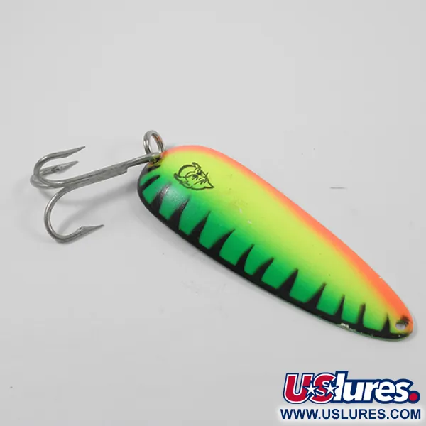 Met een gewicht van 1oz (28g) is deze klassieke Eppinger werplepel voorzien van het iconische Fire Tiger-patroon op zijn 3 1/2" (9cm) lange body. De afwerking is een levendig verloop van neongeel en groen, omzoomd met een opvallende oranje lijn en geaccentueerd door zwarte verticale strepen aan één kant. Op de koperen achterkant zijn de authentieke stempels "DARDEVLE" en "EPPINGER DETROIT" duidelijk zichtbaar, samen met de gewichtsvermelding. Dit specifieke exemplaar draagt productcode 2697 en toont het klassieke duivelskoplogo op de geverfde zijde. De hardware bestaat uit een stevige, zilverkleurige dreg verbonden door een betrouwbare splitring. Dit kunstaas verkeert in 5/5 staat en toont de zorgvuldige behandeling die verwacht mag worden van een goed bewaard gebleven verzamelobject. De messing constructie zorgt voor een natuurlijke schittering die de felle kleuren aan de bovenkant aanvult bij het vissen in wisselende lichtomstandigheden.