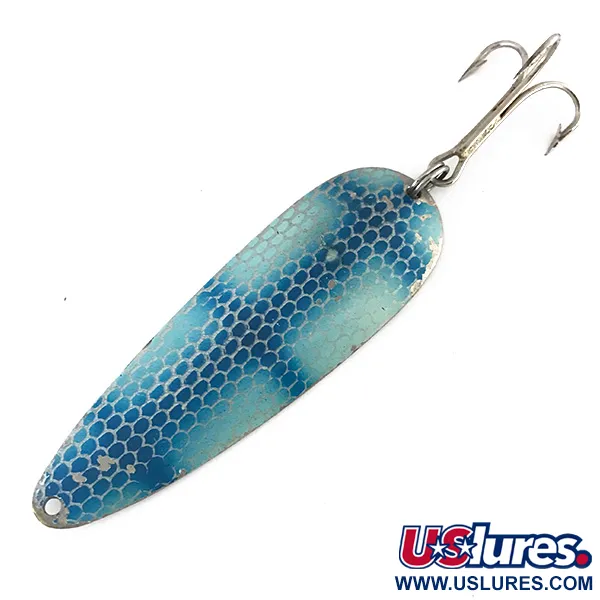 Duidelijk gestempeld in de gepolijste holle zijde, verankert het merk "Dardevle" Detroit U.S.A. de identiteit van deze Eppinger klassieker. Deze 9 cm (3 1/2") lepel heeft een lichtblauwe basislaag met daaroverheen een donkerblauw honingraat schubpatroon. De onderkant is afgewerkt met schoon nikkel, wat zorgt voor een contrastrijke schittering tijdens een gestage binnenvisser of tijdens het trollen. Dit exemplaar van 28 g (1 oz), gelabeld met code 8410, is gebouwd met het zware metaal dat de ontwerpen van Lou Eppinger sinds 1906 tot een vaste waarde in de Michigan tackleboxen heeft gemaakt. Wat betreft het beslag, de originele dreg is bevestigd via een stevige splitring, klaar voor het zware werpwerk. Qua conditie verdient deze een 4/5 waardering; hoewel er wat licht verfverlies is langs de buitenranden en de schubben iets dunner worden, blijft het metaal glanzend en de stempeling scherp. Het is een bewijs van de matrijzen die Eppinger gebruikte voor en na hun verhuizing naar Dearborn in 1959. Het gewicht van 28 g (1 oz) stelt deze lepel in staat om effectief diepere waterlagen te bereiken zonder dat er extra zinklood nodig is.