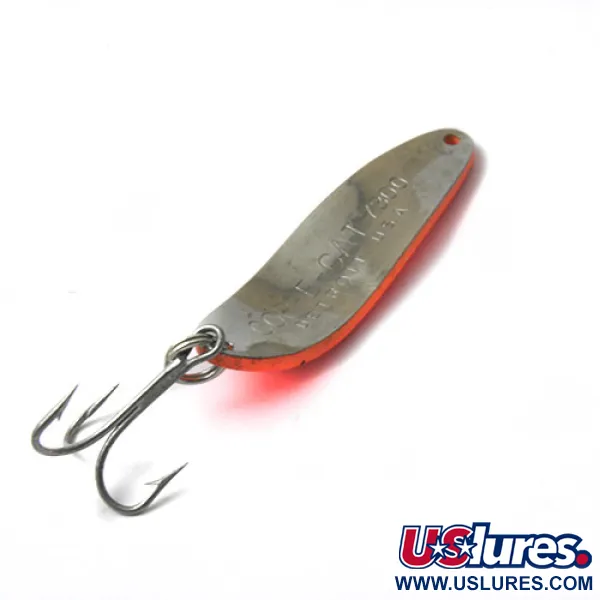 Zes duidelijke zwarte stippen zijn gestempeld op de levendige oranje afwerking van deze klassieke Amerikaanse lepel. Met een gewicht van 14 g (1/2 oz) en een lengte van 5,5 cm (2 1/4") draagt deze Eppinger Dardevle Cop-E-Cat 7300 het iconische Devil Head-logo dat deze in Michigan geboren kunstaasjes al meer dan een eeuw kenmerkt. De roodoranje lak zorgt voor een hoog contrastprofiel, terwijl het gestanste metalen lichaam is ontworpen voor veelzijdige werp- en trolltoepassingen. Geïdentificeerd door productcode 0449, bestaat de hardware uit een robuuste dreg en een betrouwbare splitringmontage. Dit specifieke exemplaar verkeert in een staat van 4/5, wat de duurzaamheid van Lou Eppinger's originele productienormen onderstreept. Het holle binnenoppervlak zorgt voor de nodige waterverplaatsing voor zijn kenmerkende actie in de waterkolom.