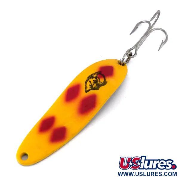 Vijf duidelijke rode ruiten steken af tegen de felgele afwerking van deze 5,5 cm (2 1/4") lepel, wat het herkenbaar maakt als het iconische Five of Diamonds-patroon. Deze Dardevle Cop-E-Cat 7300, productcode 10163, is voorzien van het beroemde duivelskoplogo dat duidelijk op de voorzijde is gestempeld. Met een gewicht van 10g (1/3oz) is het kunstaas gebouwd met een hol, langwerpig lichaam dat een specifieke waggelende actie creëert tijdens een langzame inhaalbeweging. De achterzijde onthult een strakke koperkleurige rug, gestempeld met de „COP-E-CAT“ en „DETROIT“ markeringen, wat de diepe wortels van de fabrikant in Michigan weerspiegelt sinds Lou Eppinger in 1906 begon met het handmatig maken van kunstaas. Dit exemplaar verkeert in 5/5 conditie, met levendige verf en een scherpe, zilverkleurige dreg bevestigd via een stevige splitring. Zoals alle Dardevle lepels is hij geproduceerd in de VS met eigen matrijzen om de exacte kromming te garanderen die nodig is voor effectief werpen of trollen. De combinatie van de gele voorkant en koperen achterkant zorgt voor een visueel contrast dat ervaren vissers vaak verkiezen bij het vissen in wisselende waterhelderheid.
