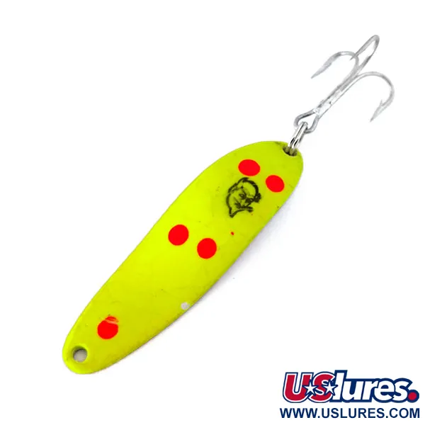 Fluorescerende gele lak bedekt de bolle kant van deze lepel, ontworpen om op te vallen in verschillende waterdieptes. Met een afmeting van 5,5 cm (2 1/4") en een gewicht van 10 g (1/3 oz) draagt deze Eppinger Dardevle Cop-E-Cat 7300 de productcode 10359. De afwerking bevat gedurfde rode stippen op een gele basis die zowel fluorescerend als UV-reactief is, wat een heldergroene gloed veroorzaakt onder ultraviolet licht in het donker. Een vernikkelde achterkant zorgt voor de nodige schittering ter aanvulling op de lak. Deze specifieke vorm, verkregen door de eigen productiematrijzen van Eppinger in Michigan, produceert een kenmerkende waggelende actie tijdens het binnenvissen. Het kunstaas verkeert in een conditie van 4/5, waarbij de lak en het gestempelde devil-head logo scherp en duidelijk zijn gebleven. Het behoudt de originele hardware, inclusief een zilverkleurige dreg en splitring.