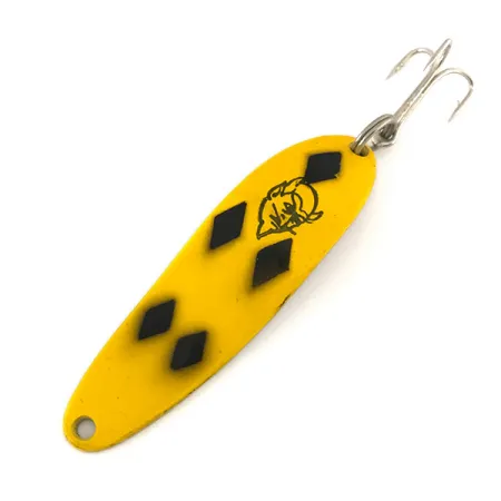Vijf zwarte ruiten op een gele achtergrond markeren het kenmerkende 'Five of Diamonds'-patroon op deze vintage lepel. Deze Eppinger Dardevle Cop-E-Cat 7300, met productcode 7524, heeft een gewicht van 1/3 oz (10 g) en een lengte van 2 1/4" (5,5 cm). De voorzijde is voorzien van het kenmerkende duivelskop-logo, terwijl de achterzijde een messing body toont met de stempel 'COP-E-CAT 7300 DETROIT USA'. Deze stempel verbindt het kunstaas met de geschiedenis van het bedrijf in Detroit vóór hun verhuizing in 1959. Een splitring verbindt een scherpe zilveren dreg met de staart van de messing blank. Dit specifieke exemplaar is ongebruikt en verkeert in conditie 6. De eigen matrijzen die door Eppinger worden gebruikt, zorgen ervoor dat de specifieke concave vorm die nodig is voor het werpen consistent blijft gedurende hun honderdjarige productiegeschiedenis.