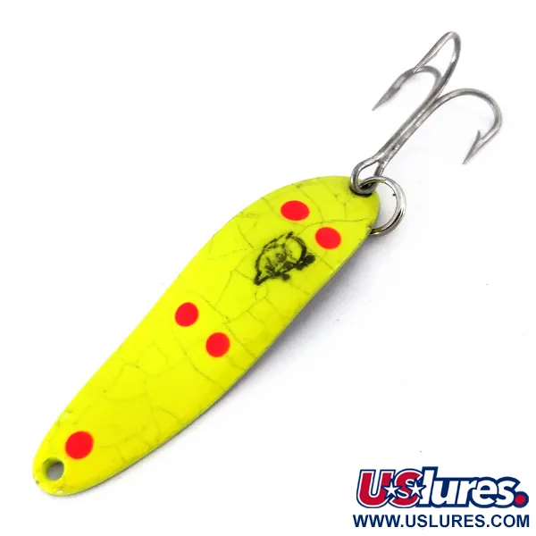 Met een gewicht van 10g (1/3oz) heeft deze Eppinger Dardevle Cop-E-Cat 7300 UV een opvallende fluorescerende gele crackle-afwerking die direct opvalt in een tacklebox. Met een lengte van 5,5cm (2 1/4") is het lichaam versierd met vijf opvallende rode stippen en het klassieke zwarte duivelskoplogo, een kwaliteitsstempel van een bedrijf dat al actief is sinds Lou Eppinger in 1906 in Detroit begon. Hoewel het er bij daglicht uitziet als een standaard high-visibility lepel, zorgen de gespecialiseerde UV-eigenschappen ervoor dat hij heldergroen oplicht in donker of diep water, wat een compleet ander visueel profiel voor vis oplevert. De vernikkelde achterzijde zorgt voor een traditionele schittering als aanvulling op de geschilderde voorzijde. Dit specifieke exemplaar verkeert in een 4/5 conditie, met goed geconserveerde verf en originele hardware. Het draagt productcode 10110 en vertegenwoordigt de langdurige Amerikaanse traditie van Eppinger's gepatenteerde gegoten lepels. De concave langwerpige vorm is ontworpen voor werpen of trollen, een ontwerp dat al meer dan een eeuw grotendeels ongewijzigd is gebleven vanwege de effectiviteit op het water.