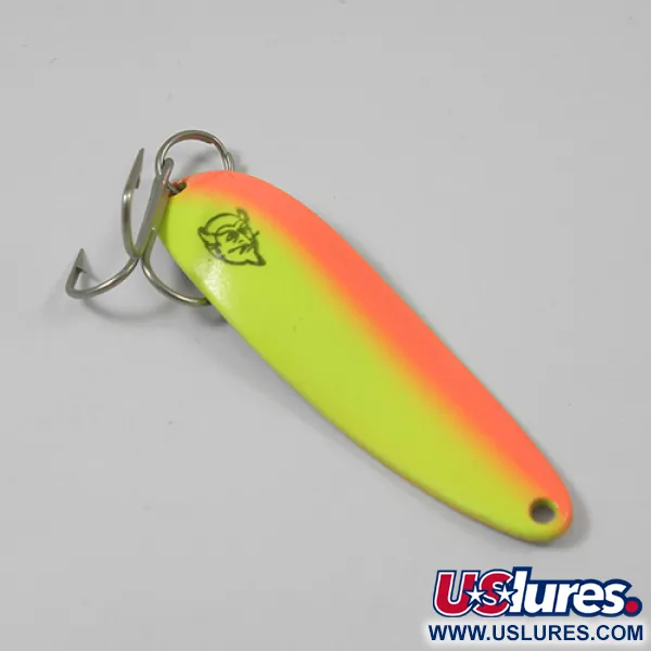 Een gewicht van 1/2 oz (14 g) zorgt voor de massa die nodig is voor verre worpen en een gecontroleerde zinksnelheid in diverse omstandigheden. Met een lengte van 6,5 cm (2 1/2") heeft deze lepel een neongele afwerking met een zacht roze verloop langs de rand en het groene 'Imp'-logo. Aan de achterzijde is het gepolijste metaal gestempeld met 'COP-E-CAT 7400' en 'EPPINGER MFG CO. DEARBORN MICH', wat wijst op de productie na de verhuizing van het bedrijf in 1959. Dit exemplaar, met productcode 1996, is in 5/5 staat, met strakke verf en een glanzende zilverkleurige achterkant. Het holle, langwerpige lichaam is voorzien van een sterke dreg en is bedoeld voor werpen en trollen. Het ontwerp produceert een kenmerkende waggelende actie bij het binnenvissen, een technisch kenmerk van Eppinger al meer dan honderd jaar.